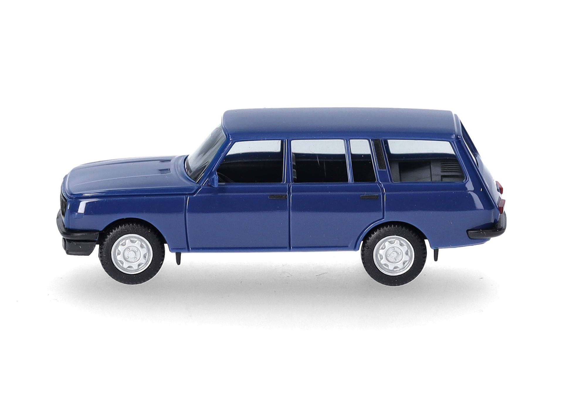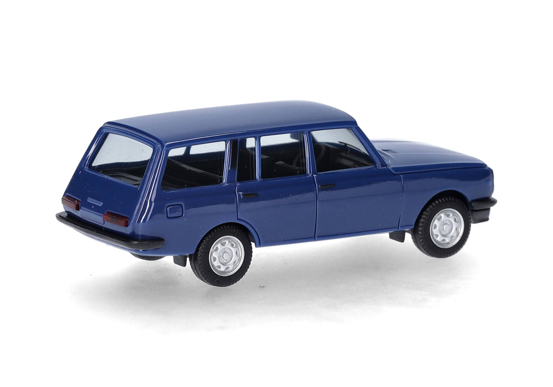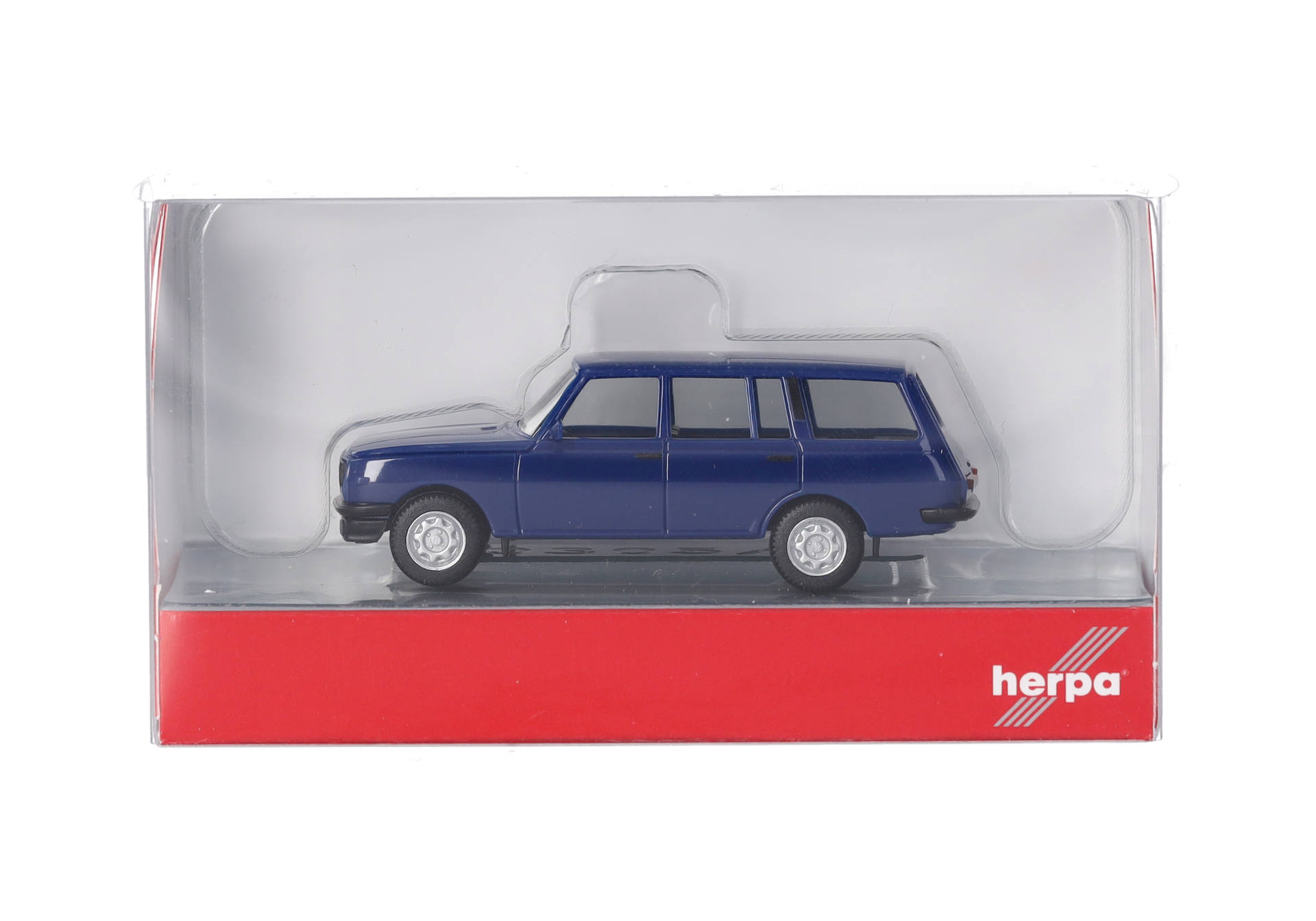 Auch der Tourist des Wartburg 353 wurde im Jahr 1984 bereits mit ersten Merkmalen der ‘85er Baureihe produziert. Auch bei diesem Fahrzeug waren Stoßfänger und der noch alte Kühlergrill in Schwarz gehalten. Das Herpa-Modell wird in Dunkelblau umgesetzt.