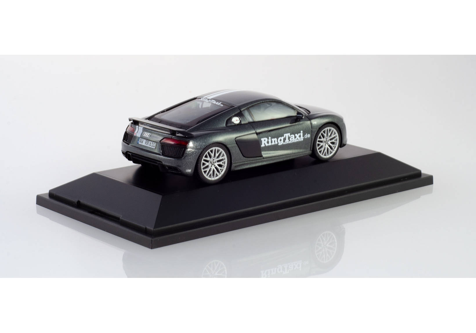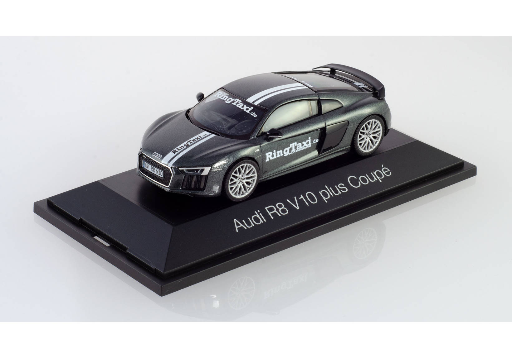 A round over the legendary Nürburgring’s Nordschleife is a special experience with the Daytona-grey-metallic-colored Audi R8 V10 Plus. The Herpa model comes in the current design in a unique edition.