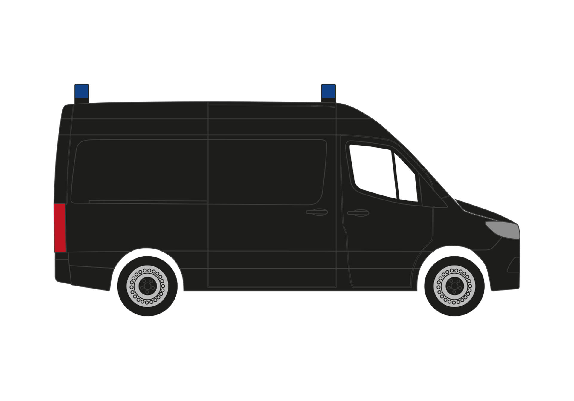 Not every ambulance is automatically colorful and eye-catching! – Aside from the blue lights and flashing lights, the black Mercedes-Benz Sprinter looks like a perfectly ordinary delivery van, while inside it is equipped with state-of-the-art emergency medical technology. This extraordinary vehicle is deployed for special missions throughout Germany and in neighboring countries and is available exclusively as a special edition model in our online shop.