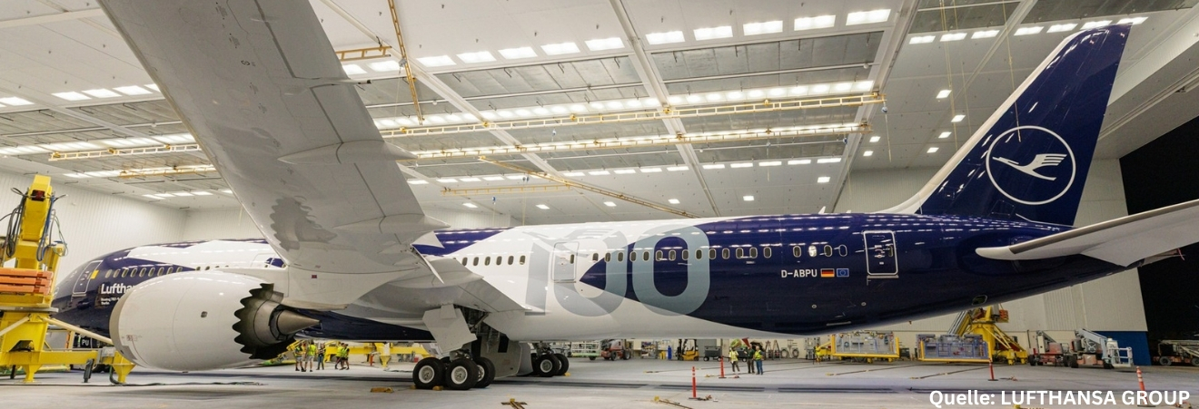 To mark its 100th anniversary in 2026, Lufthansa unveils a Boeing 787-9 Dreamliner in a stunning special livery. The blue fuselage is crowned by a white crane whose wings seamlessly merge into the aircraft’s – a symbol of movement, elegance, and tradition. Designed in 1918 by Otto Firle, the crane remains Lufthansa’s unmistakable emblem of identity. The aircraft, registered D-ABPU, received its unique livery in Charleston, USA, and will enter regular service from December.