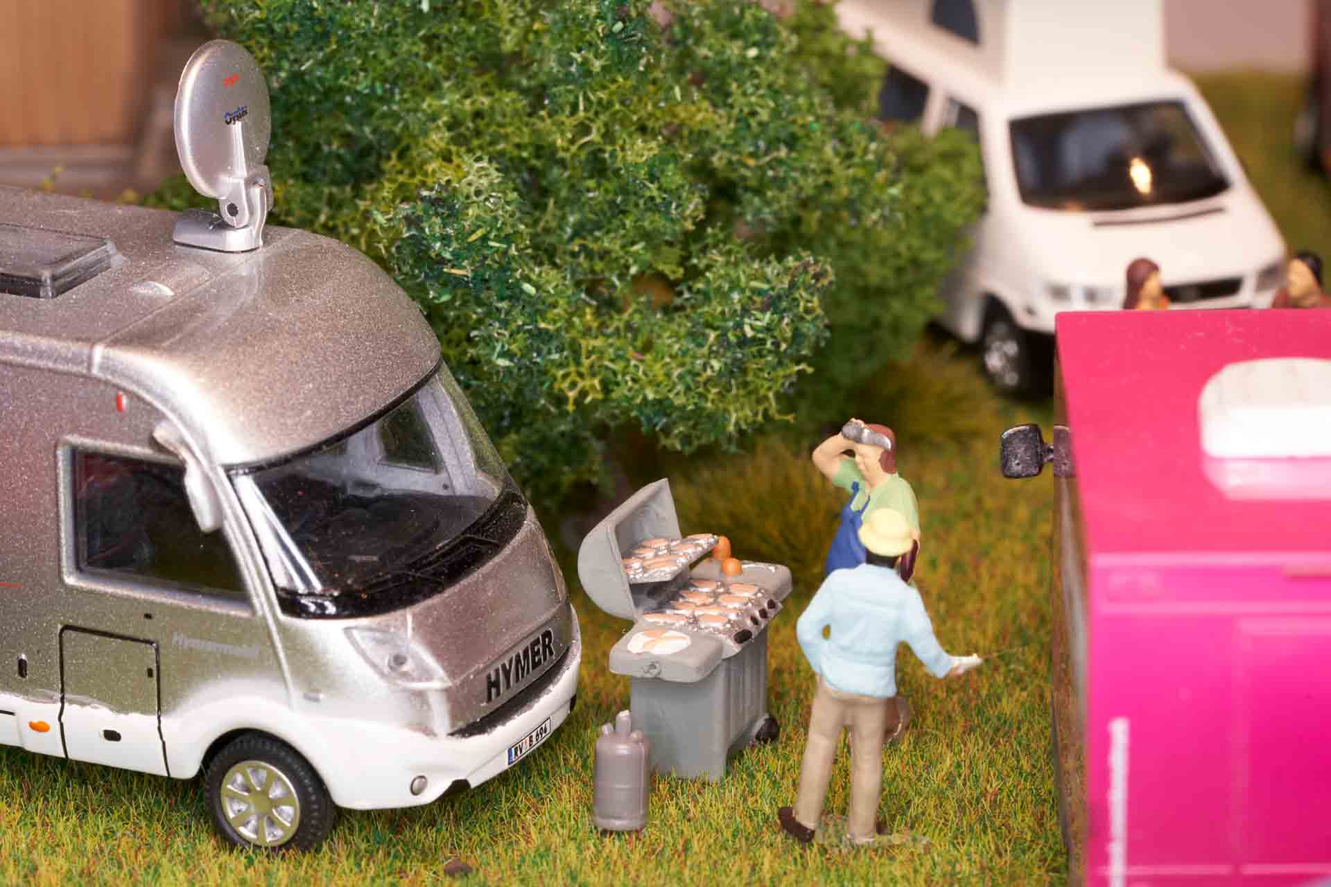Jeder Teilnehmer hat seine eigenen Vorstellungen von der Campingszenerie und so sind sehr unterschiedliche und interessante Details zu entdecken: Vom Eiswagen über einen Imbiss mit Stehtischen, eine Sandkiste für die Kinder, der gemauerten Grillstelle bis zum Waschhäuschen ist alles vorhanden. Aber überwiegend sind Camper sichtbar, die unmittelbar an ihren Wohnmobilen bzw. Wohnwagen grillen und auch dort in gemütlicher Runde zusammensitzen. Viel Spaß bei Betrachten der Bilder und beim Entdecken der vielen untergebrachten Details.