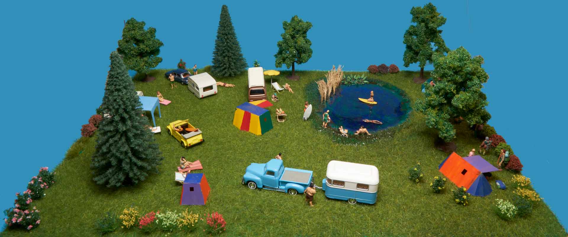 Auf den Dioramen sind einfache Campingzelte, etwas größere Hauszelte oder Dachzelte auf Fahrzeugen an Flüssen und Bachläufen, an einem kleinen See, oder in Strandnähe platziert. Kleinere und größere Wohnwagen, mit und ohne Vorzelt - und sogar mit einem demolierten Vorzelt – stehen an unterschiedlichen Orten. Spitzenreiter auf den Campingplätzen sind aber die Wohnmobile, welche in unterschiedlichen Varianten auftauchen. Vom normalen Campingbus, Wohnmobil vom Händler bis zum Umbau von Geländegängen Nutzfahrzeugen ist hier alles vertreten.