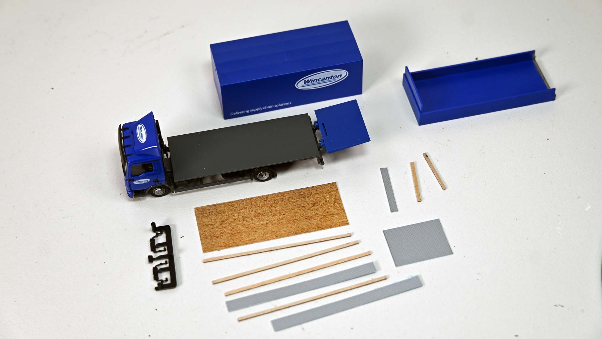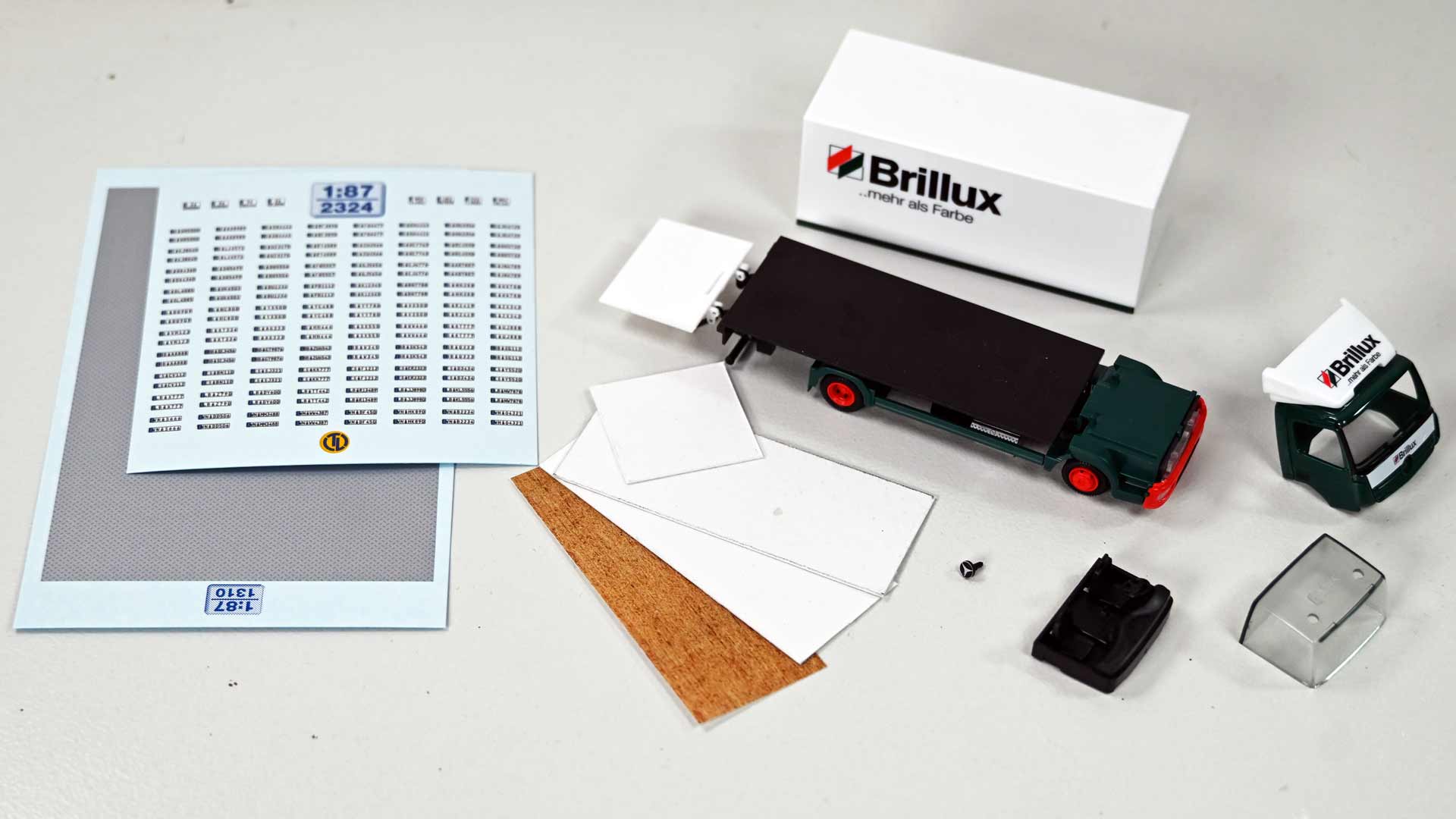 Für die Modellumsetzung benötigt der Bastler zunächst die Nachbildung eines Holzbodens für die Ladefläche sowie Riffelblech für Laderampe und Innenwände. Weitere Details, wie Nassschiebebilder mit aktuellen Kfz-Kennzeichen und Farben, um Details wie Rücklichten und Blinker hervorzuheben, komplettieren die Materialiste.