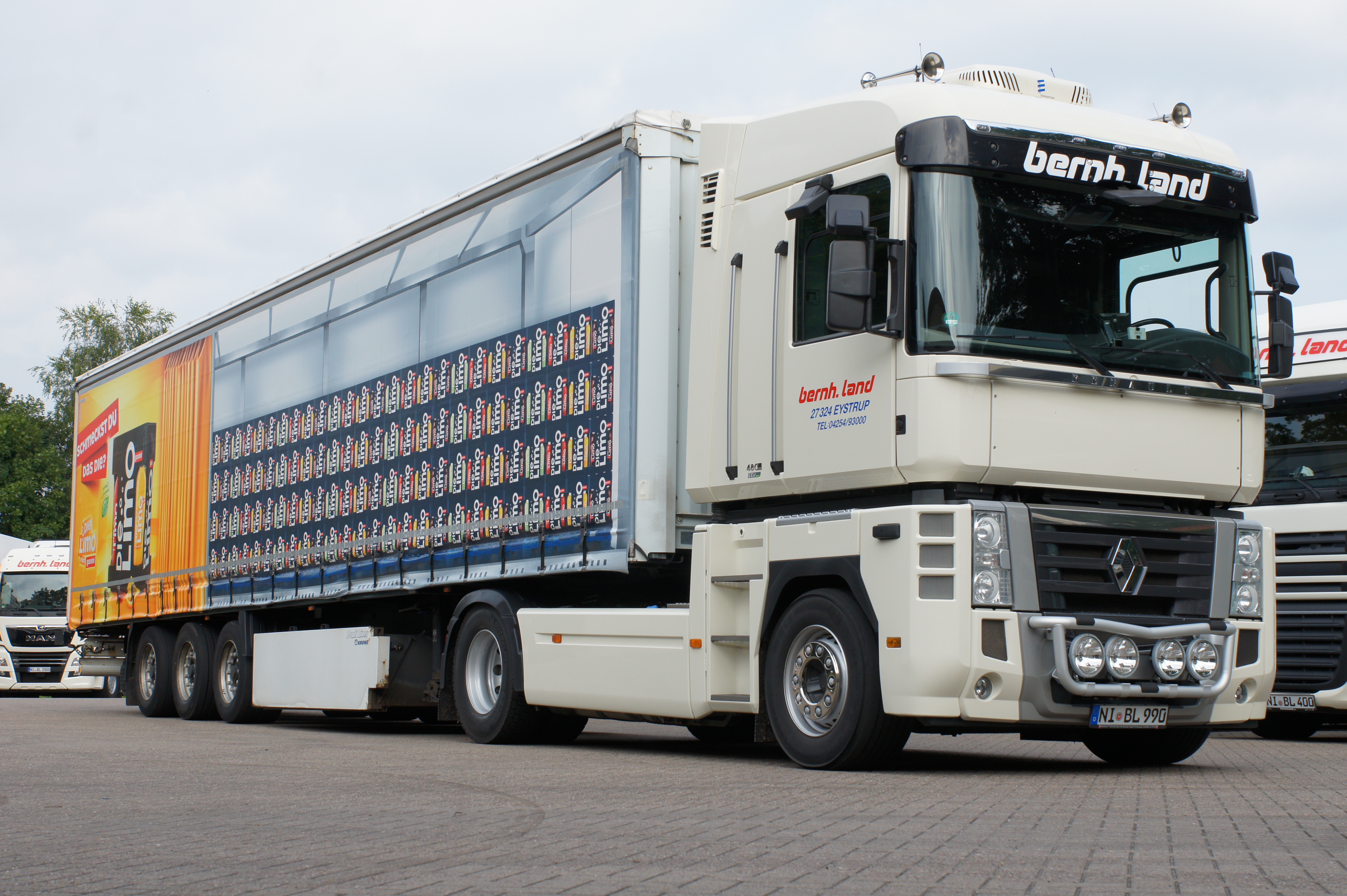 Natürlich wurden im Laufe der Zeit auch Renault Magnums in der Speditionsfarbe „RAL 1013 perlweiß“ beschafft. Insgesamt kann man sagen, bildeten die Renault Magnums immer die „Spitze“ des Fuhrparks, denn in der Masse sind und waren weiterhin MAN Zugmaschinen zahlreich vertreten. Gleichwohl gesellten sich im Laufe der Zeit sogar einige Renault Premium Fahrzeuge hinzu. Bernhard Land Senior, wie auch heute Holger Land, lassen es sich nicht nehmen, die letzten beiden im Fuhrpark verbliebenen Renault Magnums hauptsächlich selbst zu pilotieren.