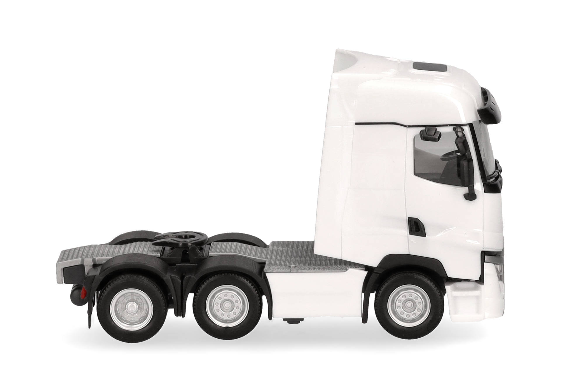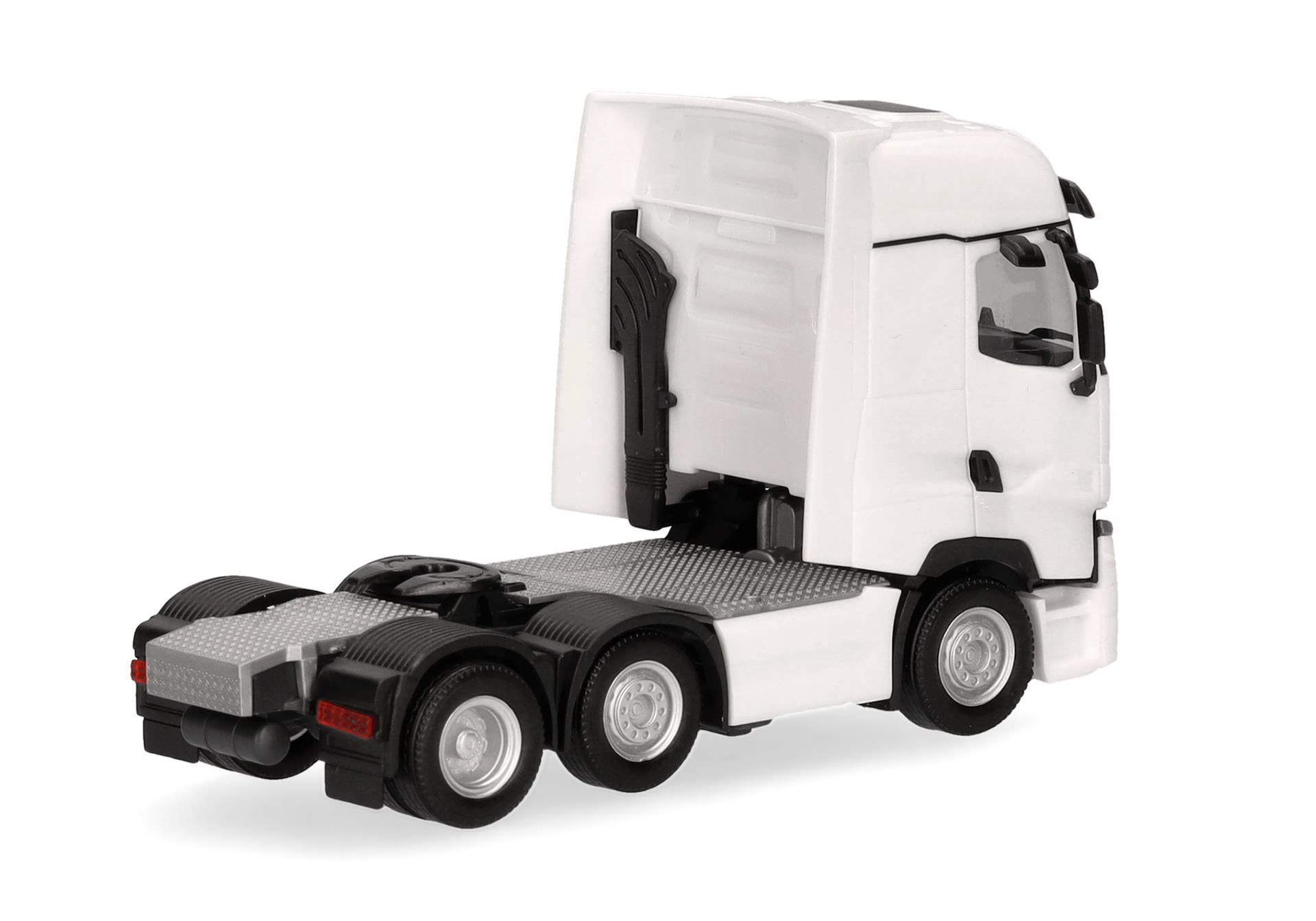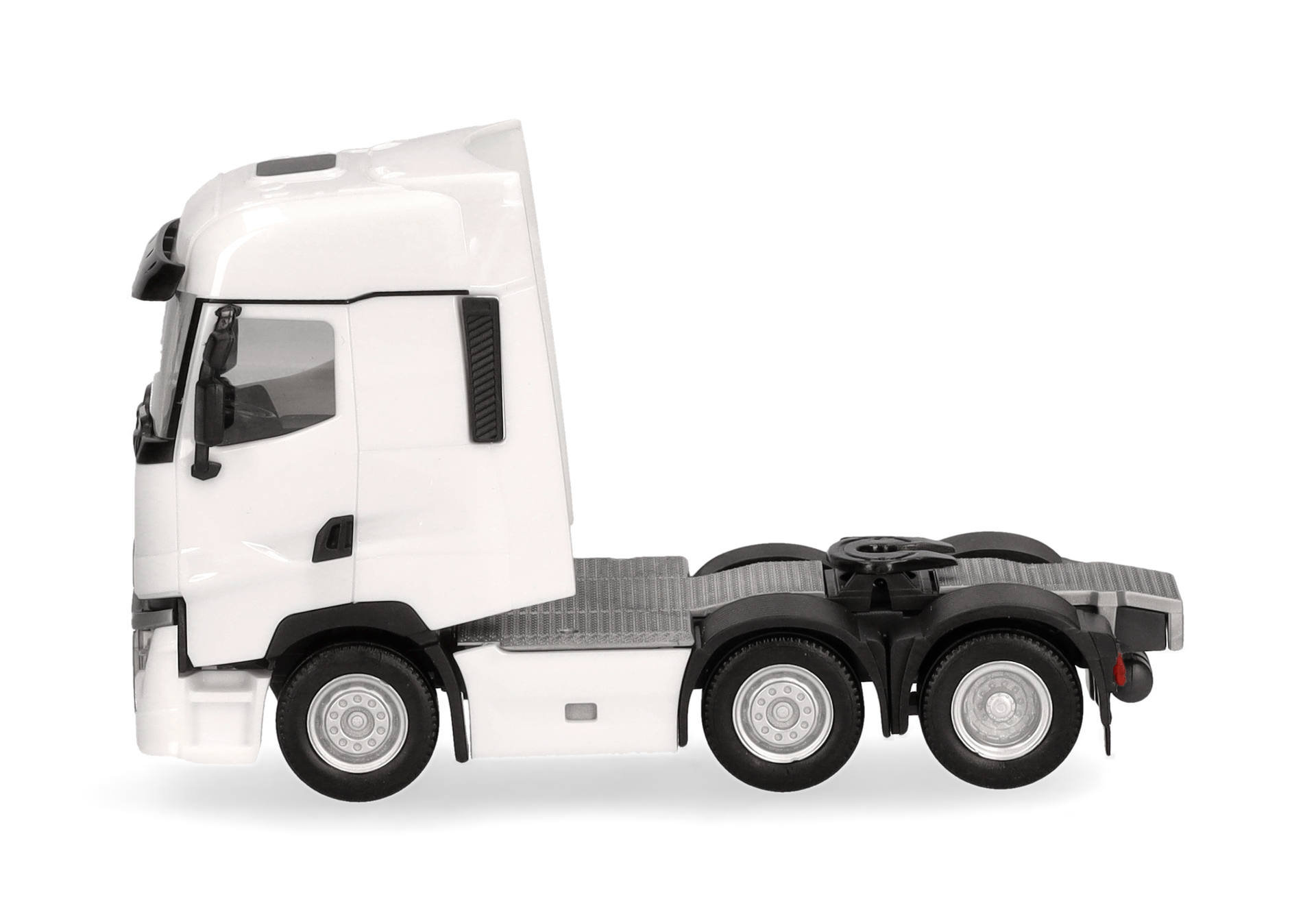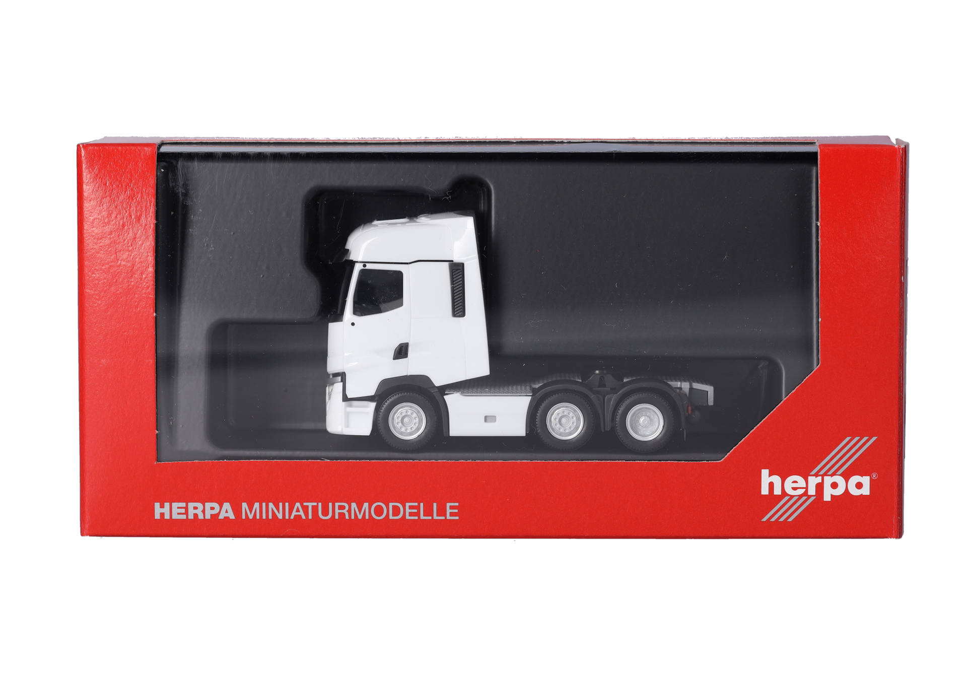 Blau und Rot waren die ersten Farben der 3-achsigen Renault T Facelift Zugmaschine in der Ausführung mit Vorlaufachse. Das Modell (auch erhältlich mit Chassisverkleidung) erscheint in schlichtem Weiß.