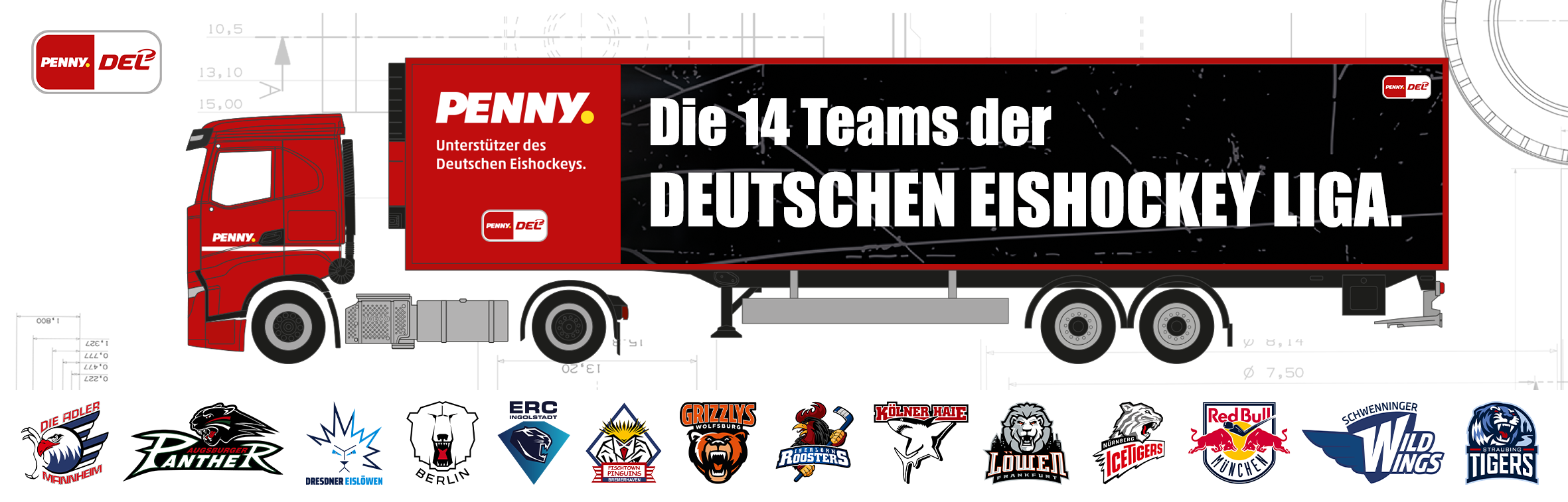 Die PENNY DEL ist die höchste Spielklasse im deutschen Eishockey. Der Titelpartner PENNY hatte zur Saison 25/26 die Idee, allen PENNY DEL Clubs die Möglichkeit zu geben, einen eigenen PENNY LKW zu gestalten. Herausgekommen sind 14 wunderschöne Motive, die wir in Zusammenarbeit mit der Liga im Modell entsprechend umsetzen und die bald auch auf den Straßen zu finden sein werden. Alle Modelle erhalten eine einheitliche Sonderverpackung und erscheinen in einer einmaligen und limitierten Auflage.
