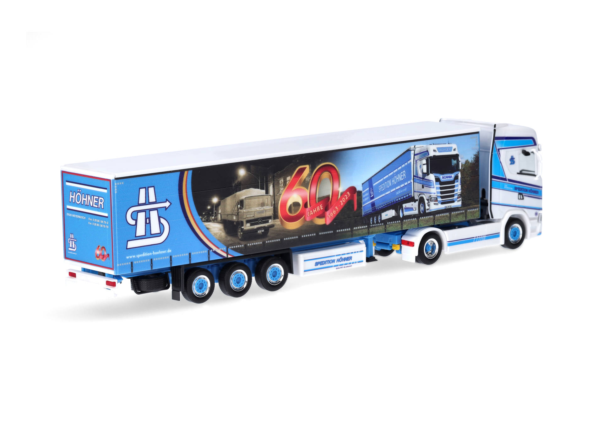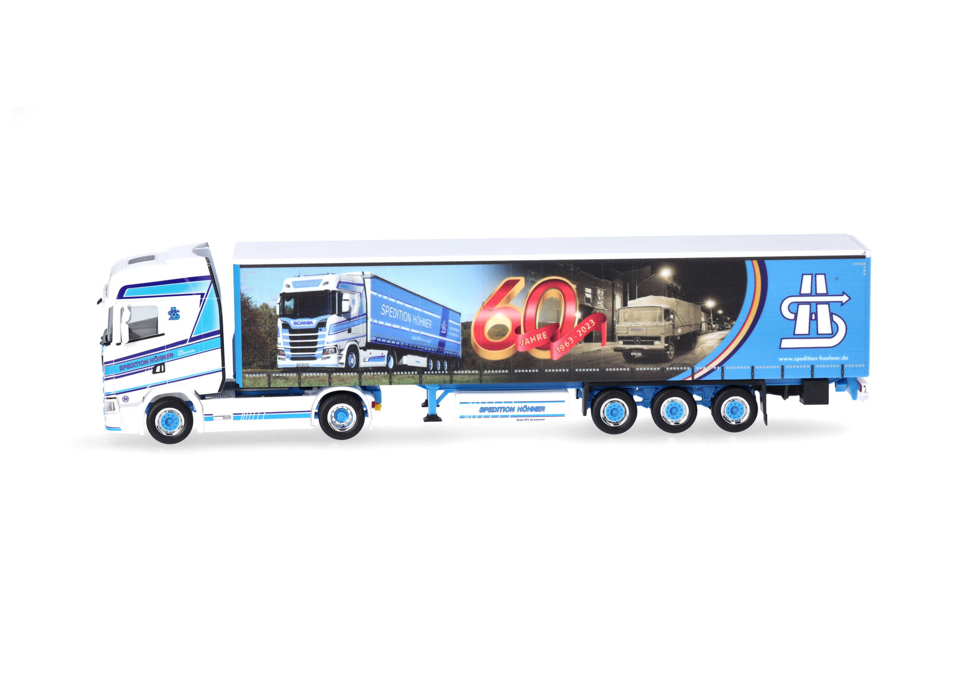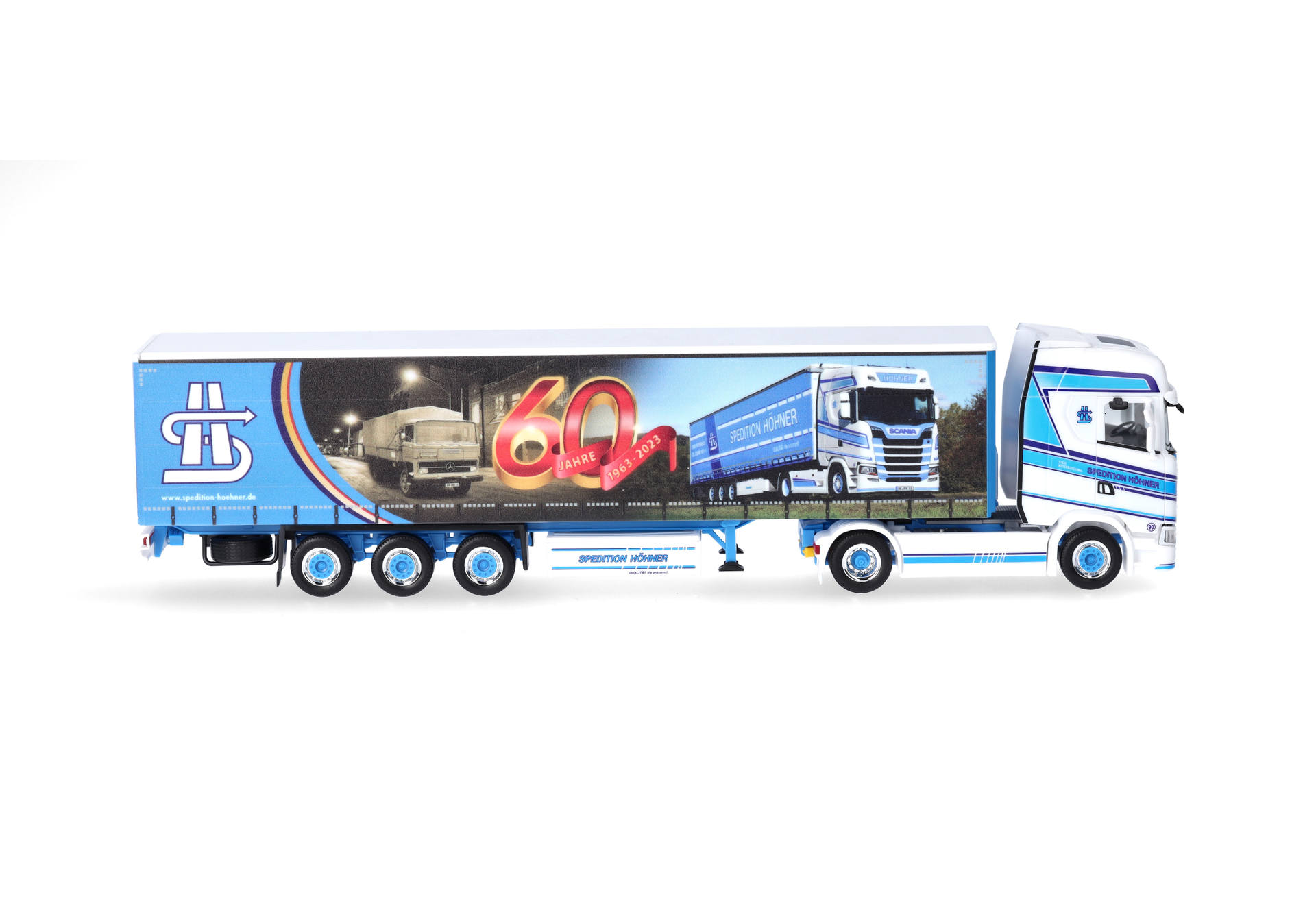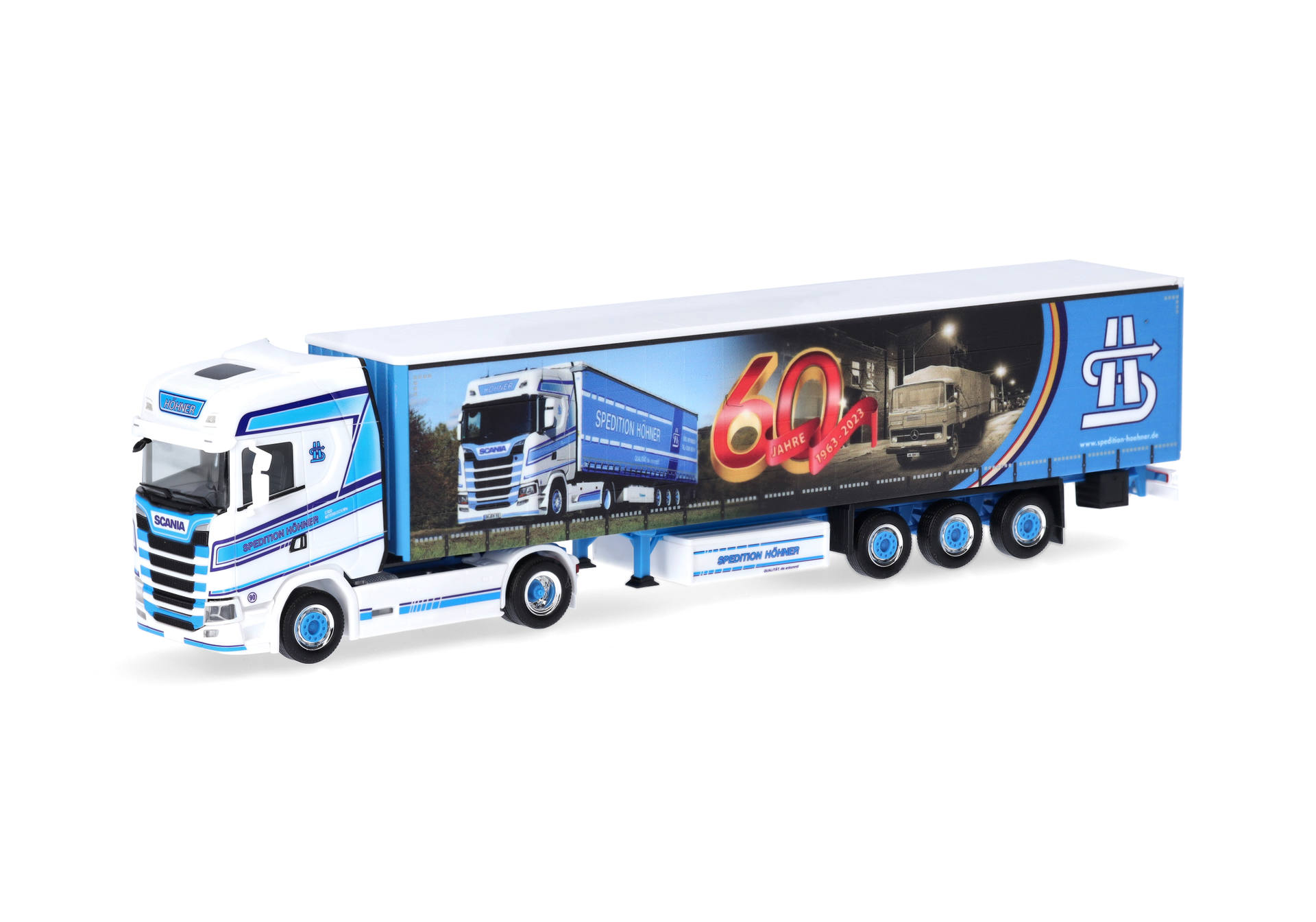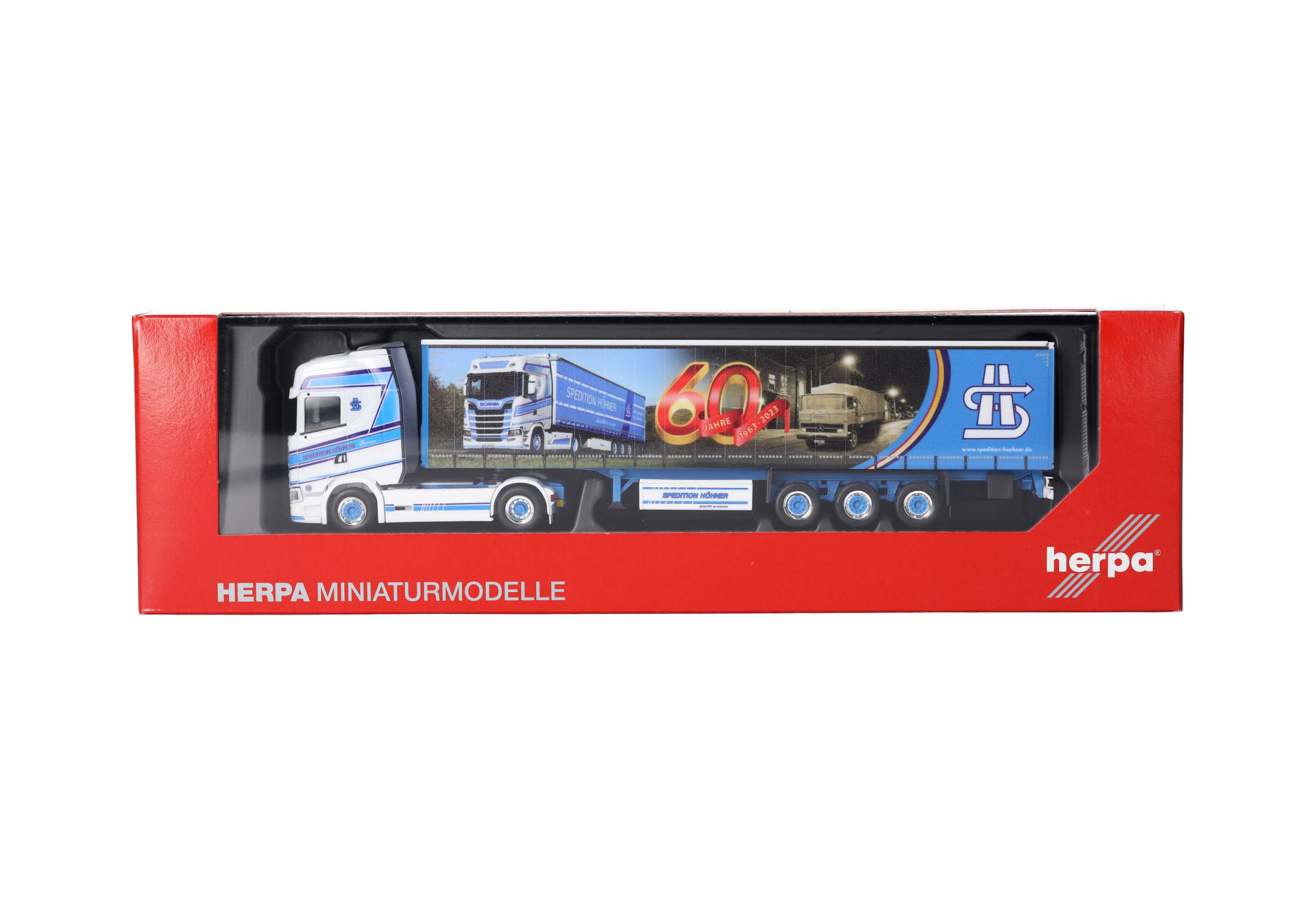 Bei Herpa ist die Spedition Höhner schon länger ein Thema. Es wurden bereits mehr als 15 Modelle realisiert. Deutschlandweit steigerte das Unternehmen aus Weyerbusch in Rheinland-Pfalz den Bekanntheitsgrad durch Trucker-Babe Tinka (311199). 2023 konnte die Spedition ihr 60-jähriges Jubiläum feiern, was auch Anlass für die Planenbedruckung ist. In dritter Generation beschäftigt man rund 100 Mitarbeiter, die dafür sorgen, dass die LKWs Teil- oder Komplettladungen auf deutschen Straßen transportieren. Das Modell erscheint in limitierter Auflage.
