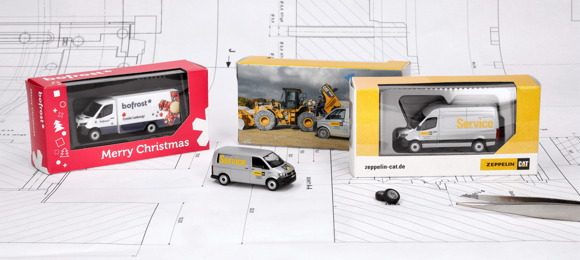 Überraschen Sie Ihre Kunden und Geschäftspartner mit hochwertigen Werbemodellen. Mit Herpa können Sie Ihr Fahrzeug in Klein individuell gestalten – vom Modellauto bis zum LKW-Modell. Schon ab 500 Stück entstehen Miniaturen, die begeistern und im Gedächtnis bleiben.